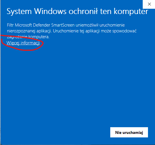 W przypadku, gdy system Windows uzna ten plik za szkodliwy, nalezy kliknac WIECEJ INFORMACJI, a następnie URUCHOM MIMO TO.