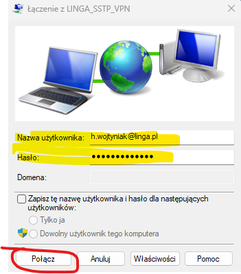 W oknie,wpisujemy swoj login oraz haslo, po czym klikamy POŁĄCZ.