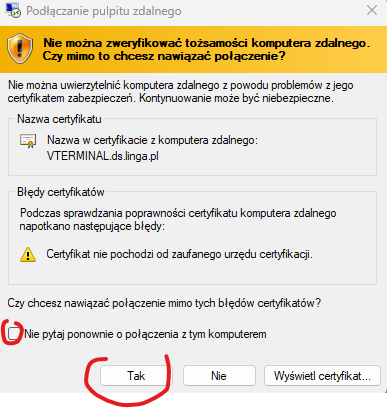 W przypadku pojawienia się poniższego okna, klikamy tak jak jest to zaznaczone na zrzucie ekranu:
